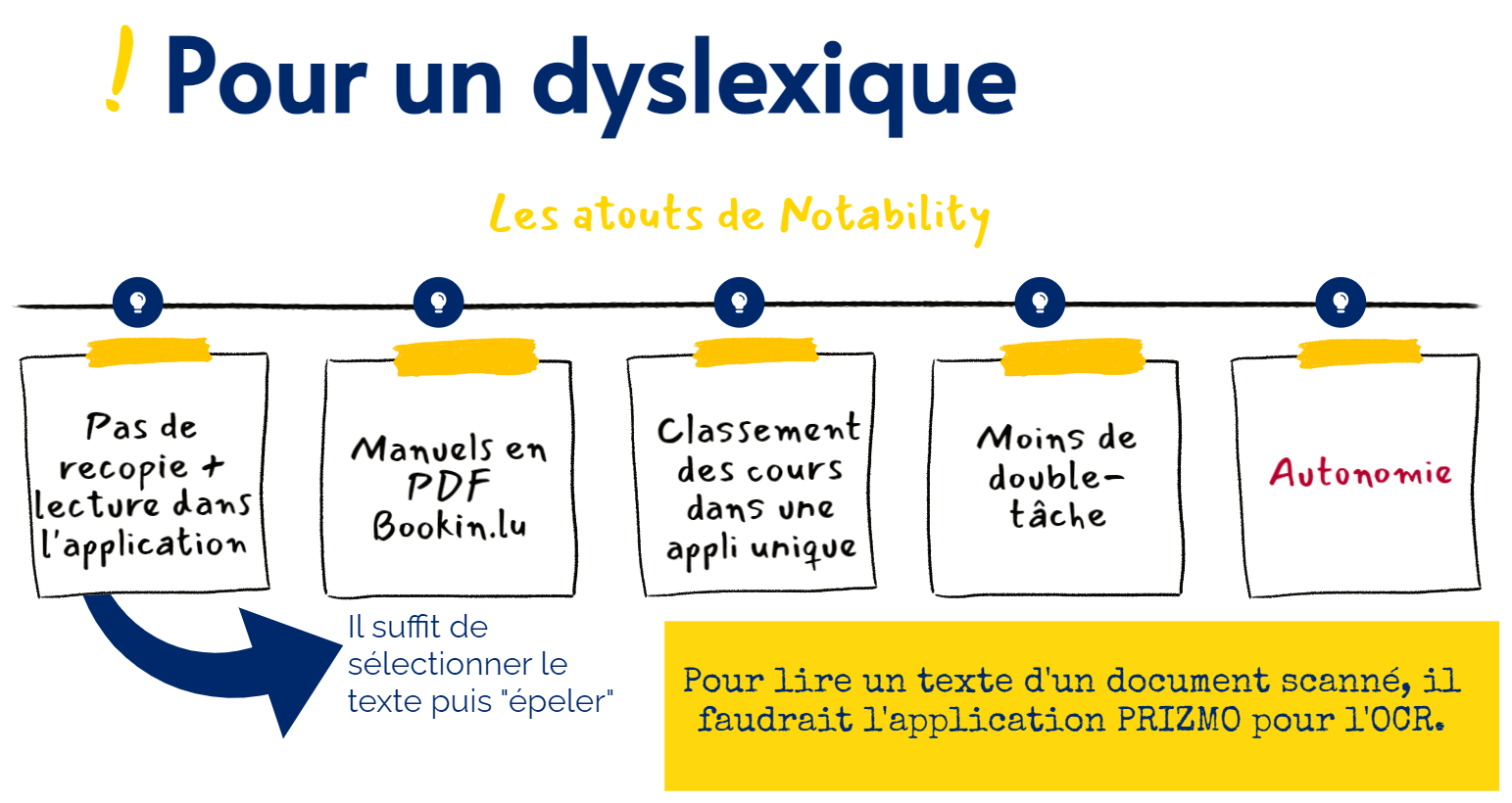 C'est grâce à cette application que l'enfant dys va pouvoir prendre des notes, "scanner" en utilisant l'appareil photo de l'iPad (numérisation de documents), écrire avec un clavier externe (dyspraxie), faire lire un texte (dyslexie).